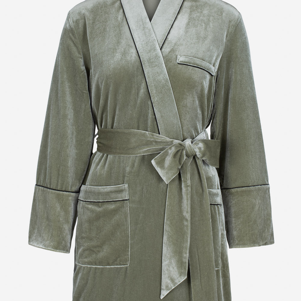Nydelig fotsid morgenkåpe i fløyel med svarte sateng detaljer og bredt belte i livet. Perfekt til lange morgener og late dager. Morgenkåpen er 143 cm lang