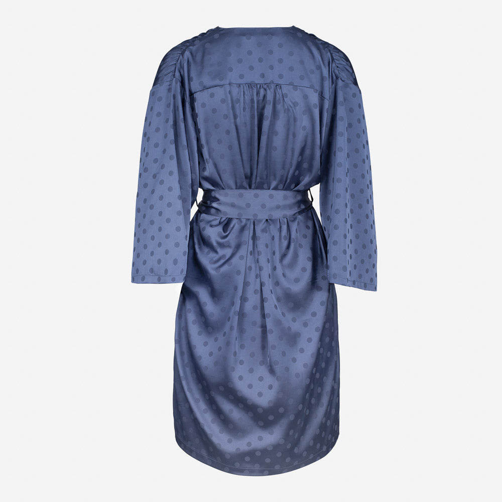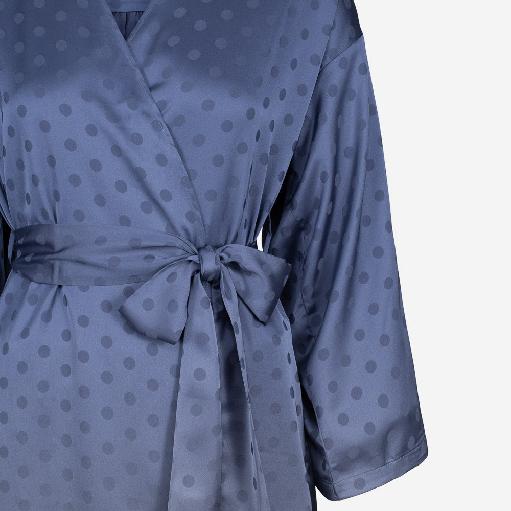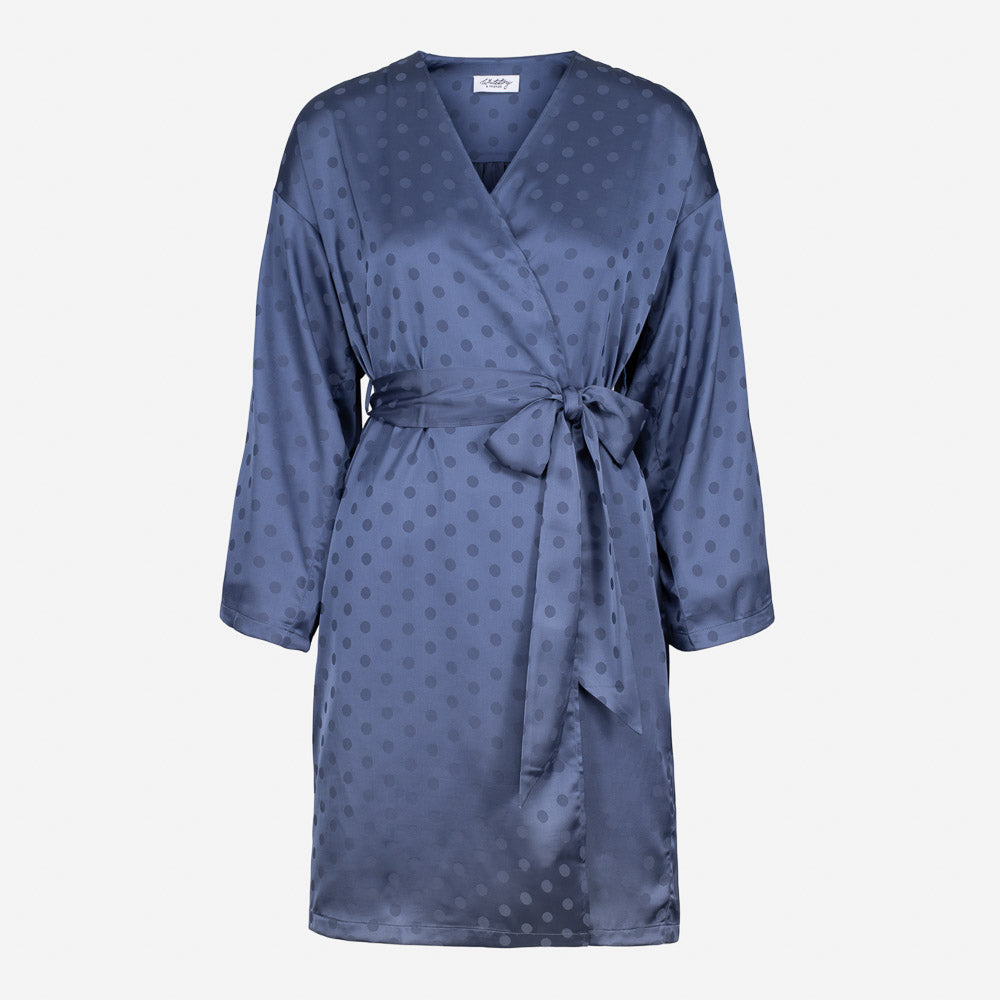 Morgenkåpe med belte i livet. Nydelig med ton i ton prikker i sarte farger. Perfekt til forlover, eller om du bare vil unne deg noe ekstra! Morgenkåpen er 97 cm lang i S/M og 100 cm i L/XL.