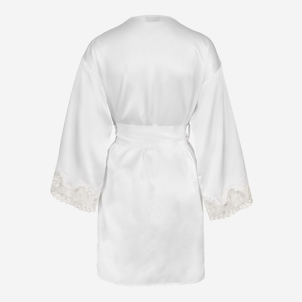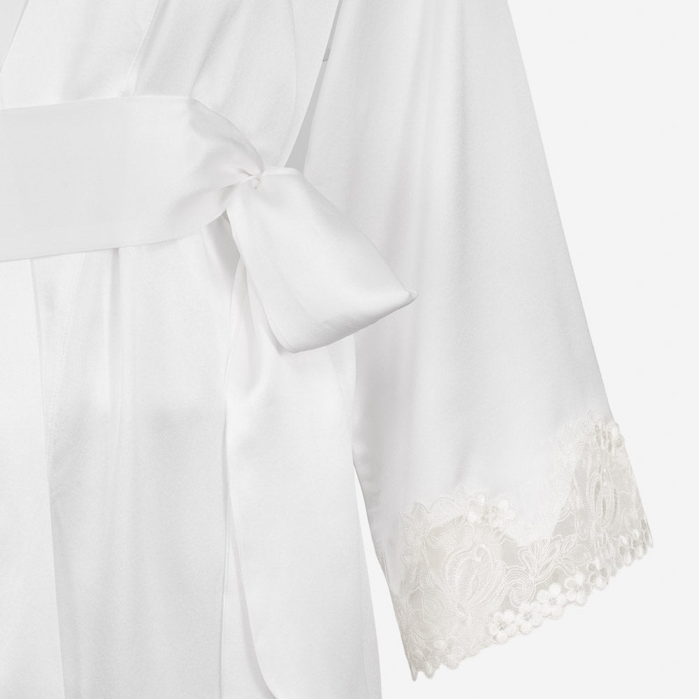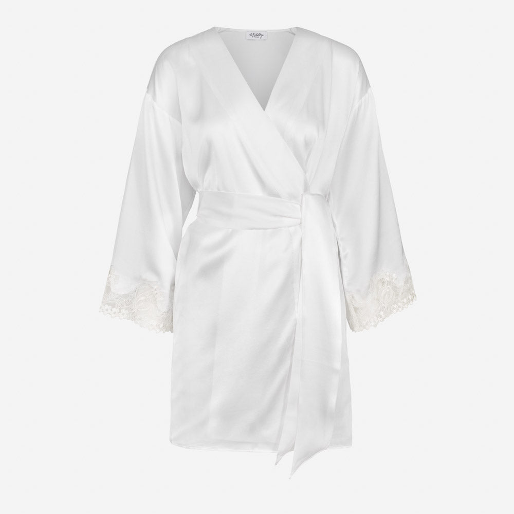 Nydelig luksuriøs morgenkåpe i silke med beige blonde detaljer. Morgenkåpen har et bredt belte i livet. Denne morgenkåpen er som skapt for bruder som sitter i sminken og vil føle seg ekstra fine. Denne modellen kommer i både kort og lang. Lengde på den korte er 95 cm.