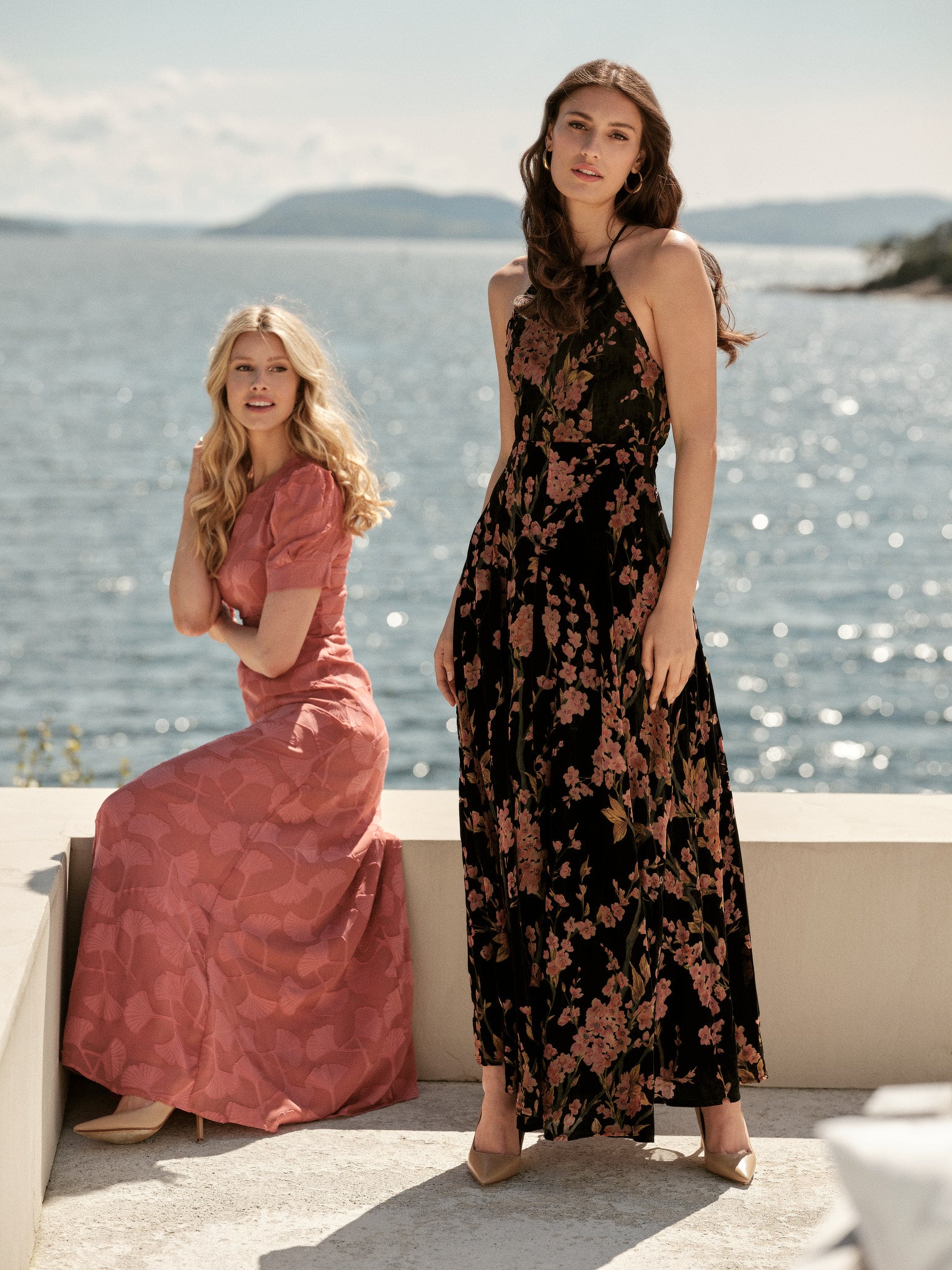 Fantastisk kjole i fløyel der blomstene i kjolen er laget i vevet organza. Dette gir kjolen et helt spesielt liv og særegenhet. Bunnfargen er svart, men kjolen oppfattes ikke som mørk da det er store rosa blomster. Skjørtet har en stor vidde nederst som gjør at skjørtet blir luftig, og en drøm å danse med! Kjolen er foret og lukkes med glidelås bak. Stroppene på kjolen går i kryss bak og kan reguleres.