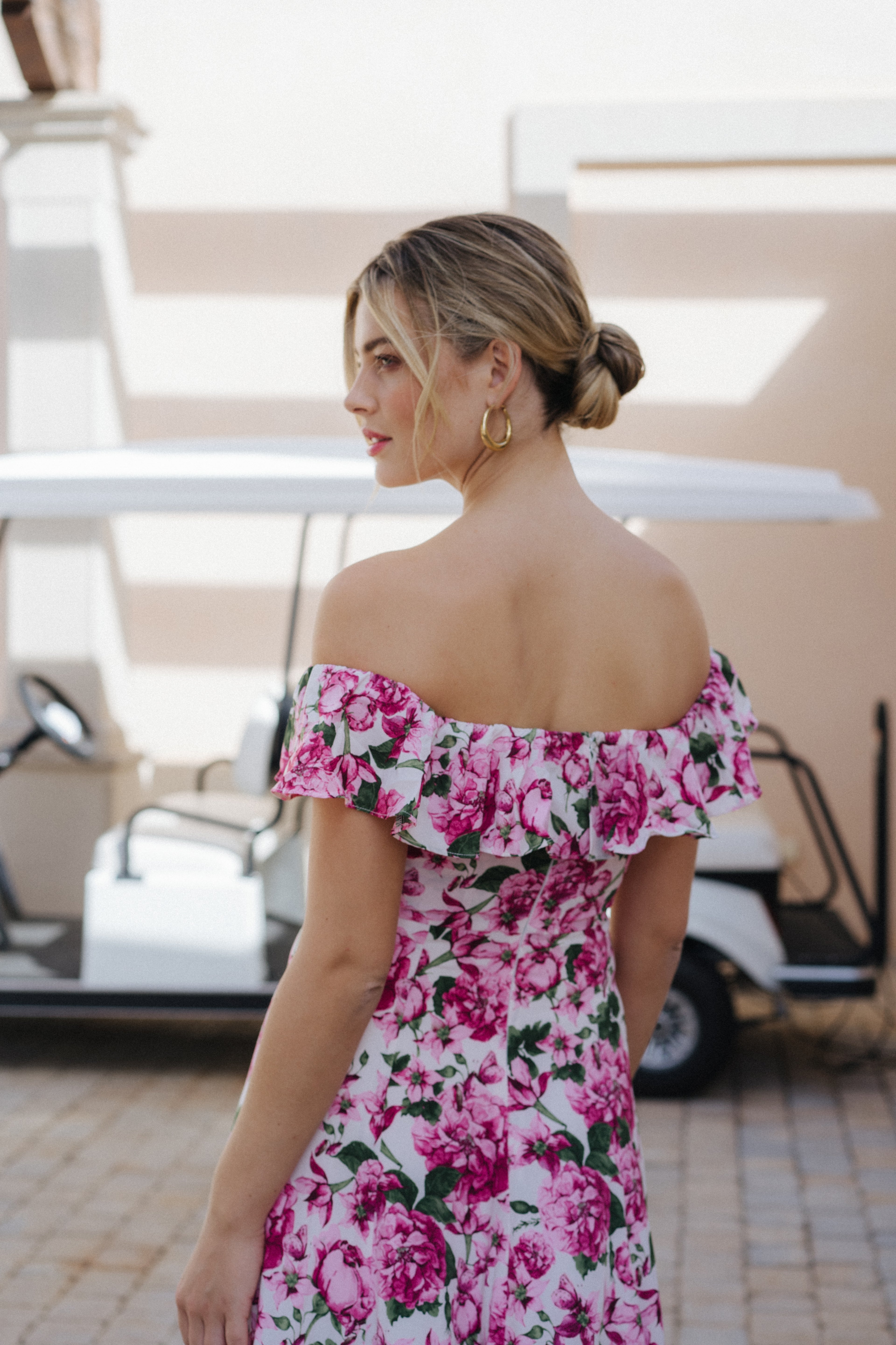 Nydelig "off sholder" kjole i hvit med rosa blomster. Modellen er figursydd med glidelås bak. Skjørtet har en stor vidde nederst som gjør at skjørtet blir luftig, og en drøm å danse med!