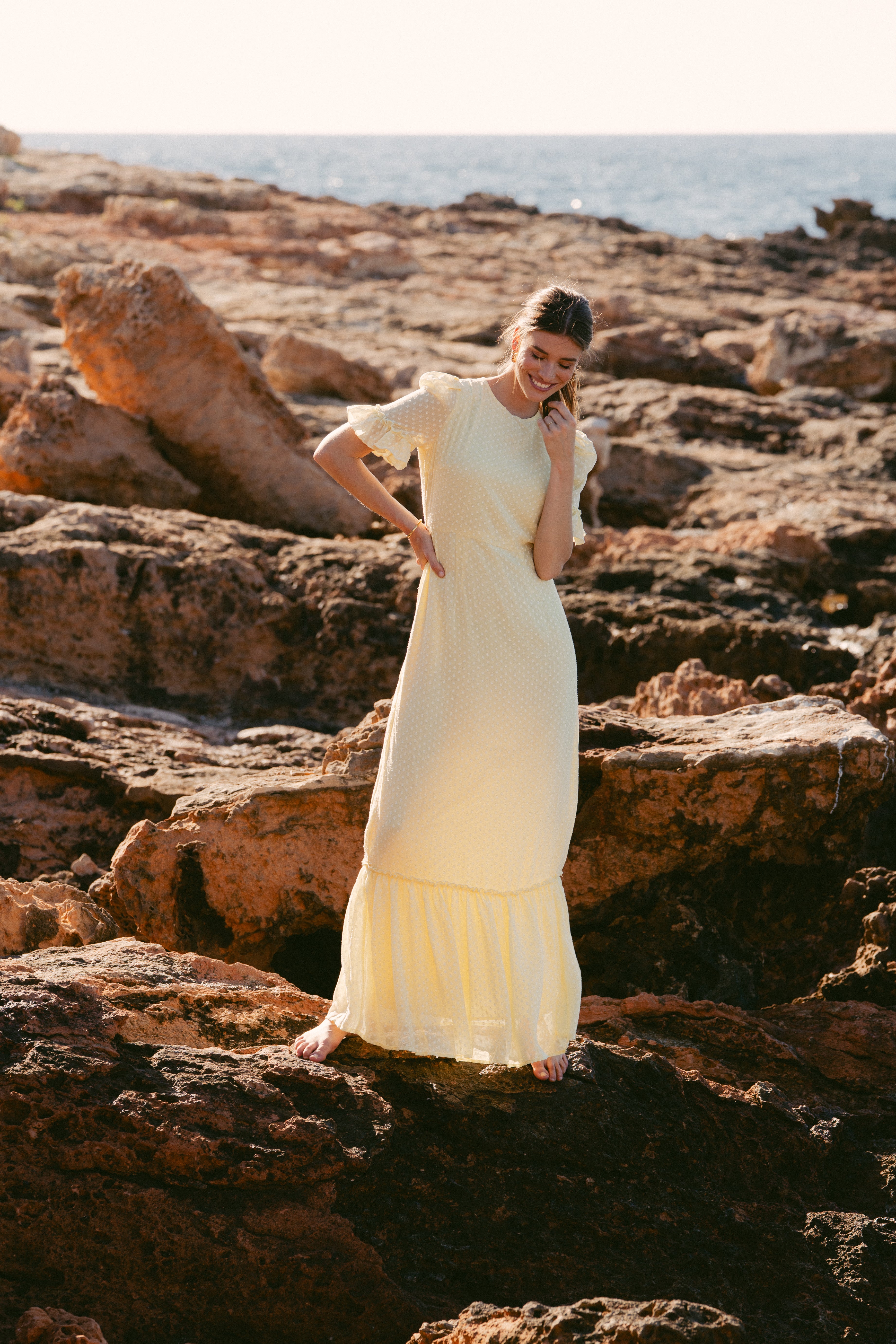 Nydelig figursydd kjole med ton i ton prikker. Kjolen har 1/3 armer med volang nederst. Det er også en volangkant lengre ned på kjolen. Kjolen er helt lukket bak, og lukkes med glidelås.