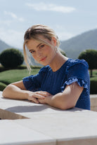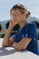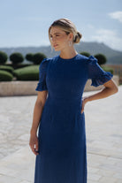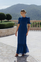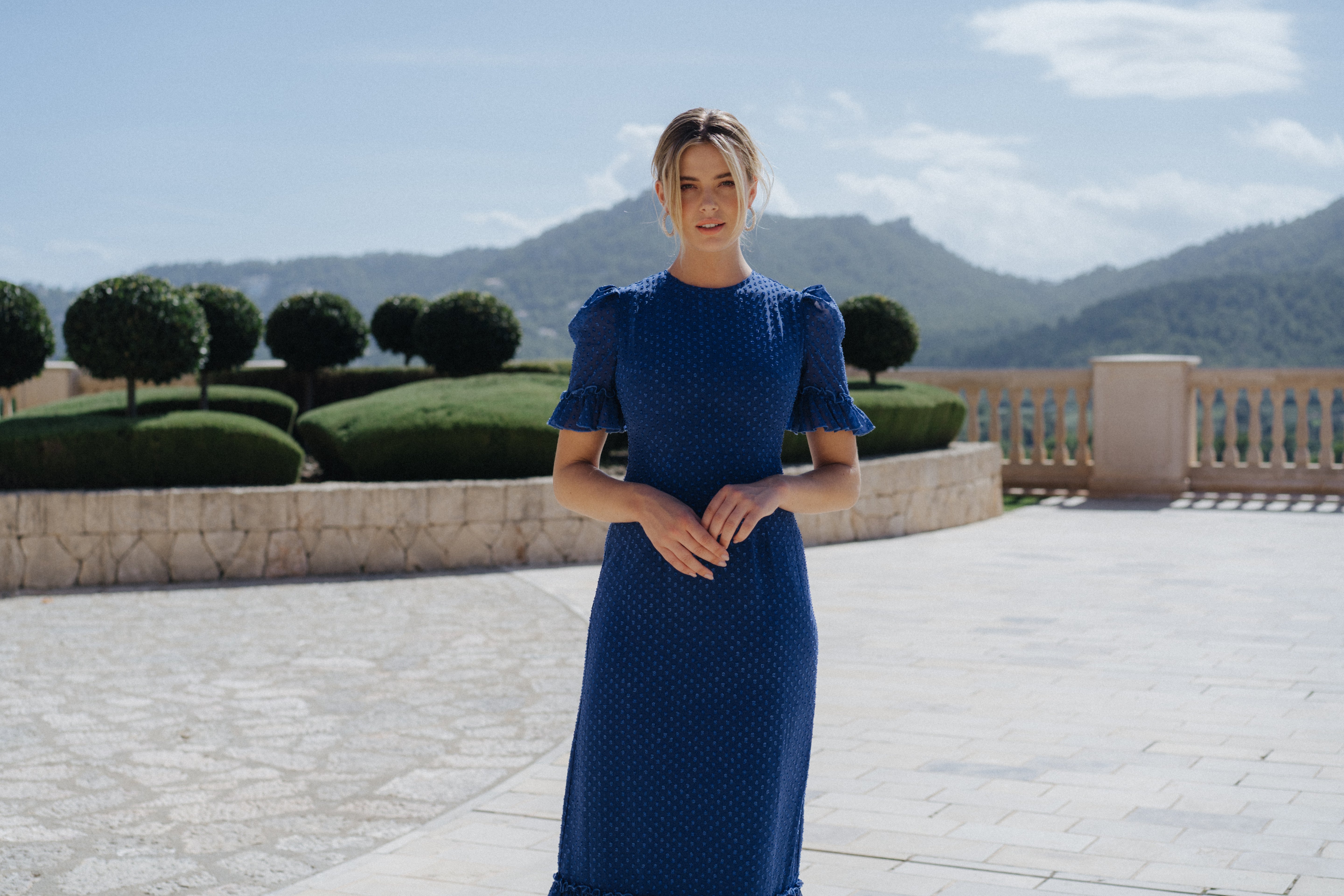 Nydelig figursydd kjole med ton i ton prikker. Kjolen har 1/3 armer med volang nederst. Det er også en volangkant lengre ned på kjolen. Kjolen er helt lukket bak, og lukkes med glidelås.