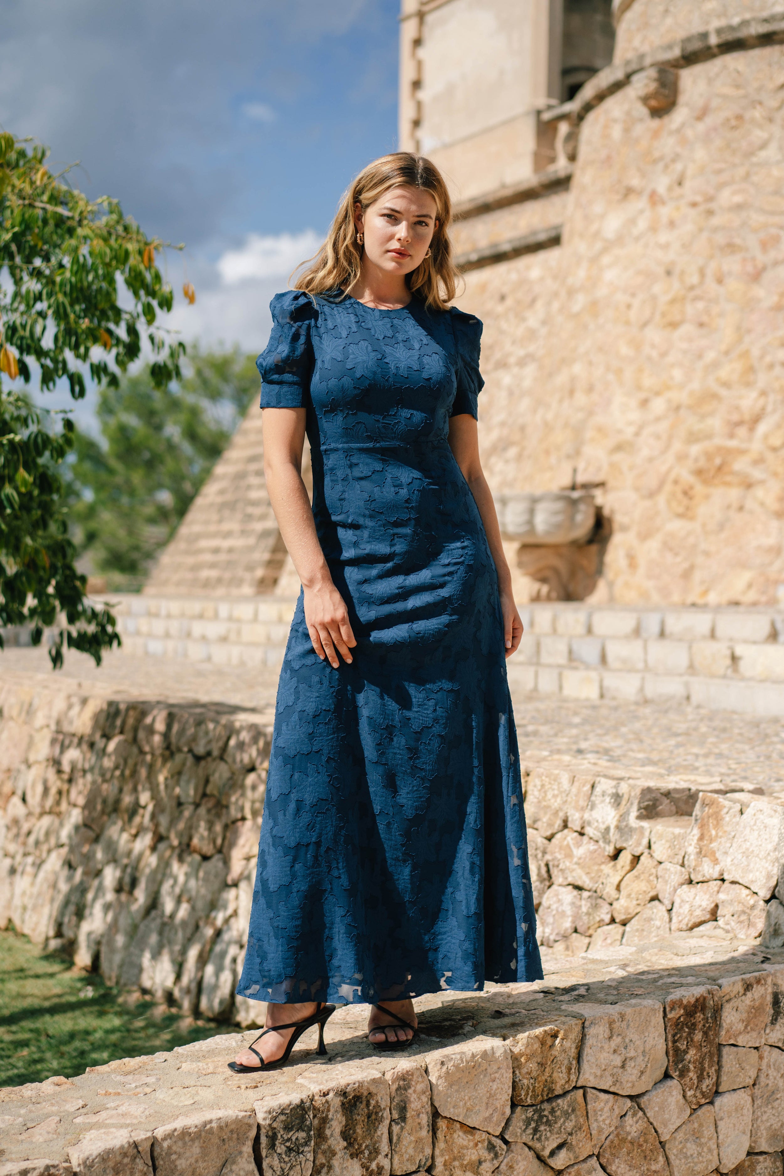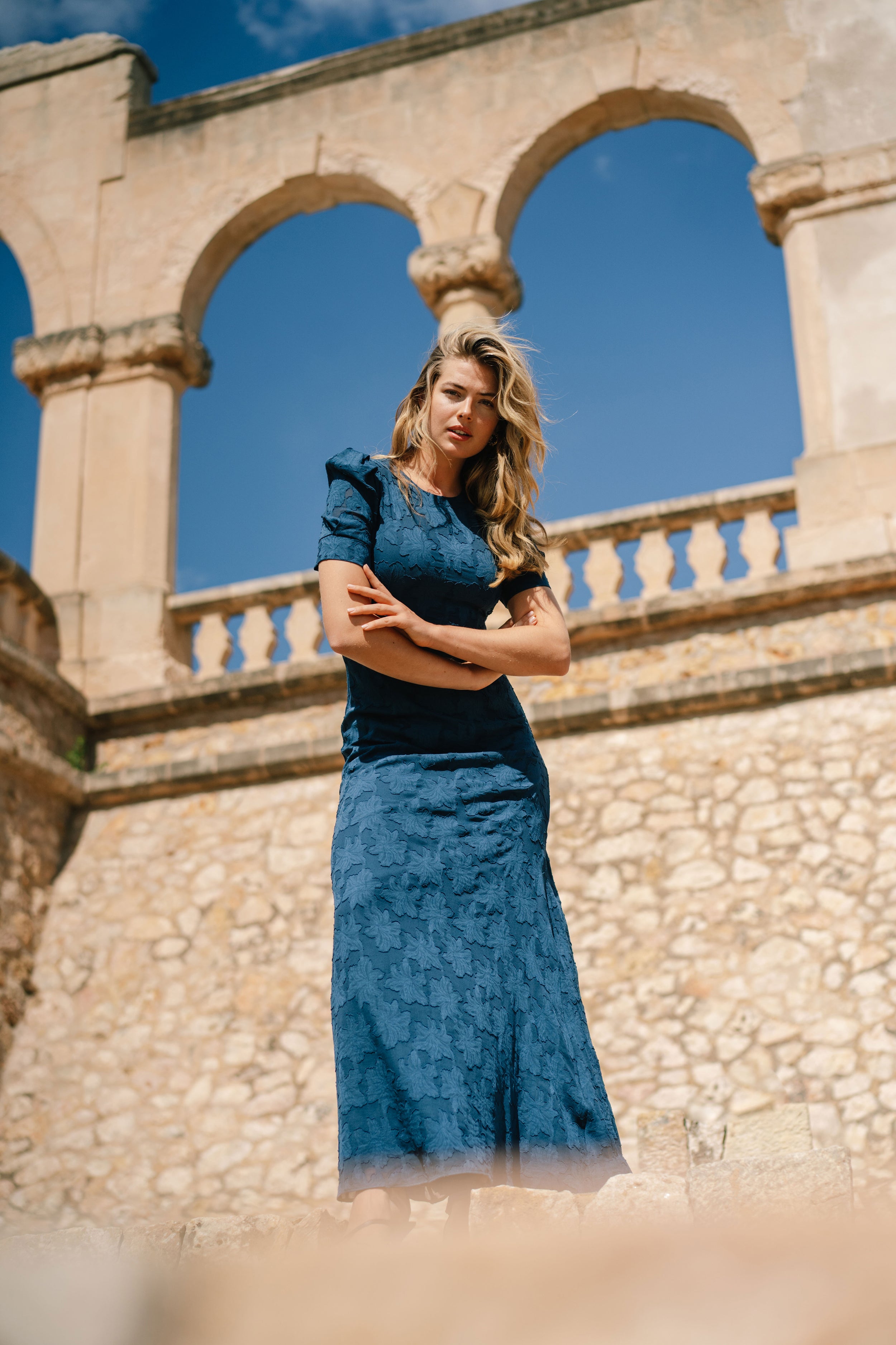 Nydelig figursydd kjole med ton i ton mønster. Kjolen har 1/3 armer og er foret. Kjolen er helt lukket bak, og lukkes med glidelås. Kjolen kan være noe liten over rygg/bryst. Vi anbefaler å måle mot størrelsesguiden under.