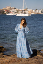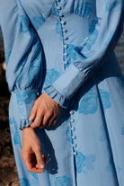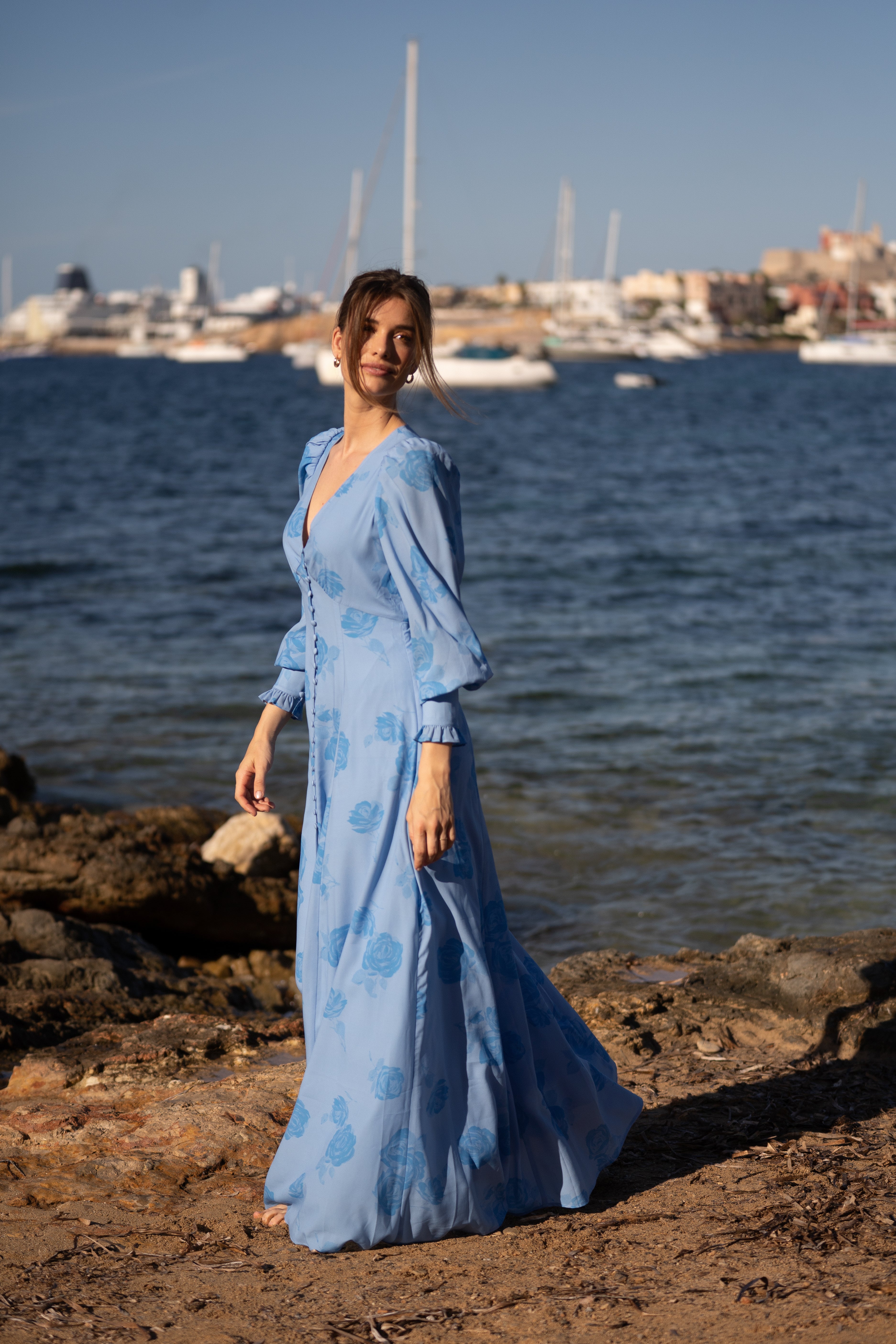 En drømmende og elegant maxikjole i en myk, lys blå tone med delikat blomsterprint. Kjolen har en flatterende V-utringning og en innsvingt midje som fremhever silhuetten på en feminin og sofistikert måte. De lange, lett voluminøse ermene gir et romantisk uttrykk, mens knappedetaljene foran tilfører et tidløst og eksklusivt preg. Den diskrete splitten i front gir kjolen en lett og bevegelig følelse. Style den med sandaler for en avslappet look, eller med hæler for en mer pyntet anledning.