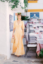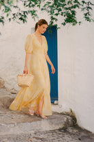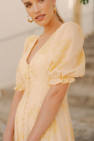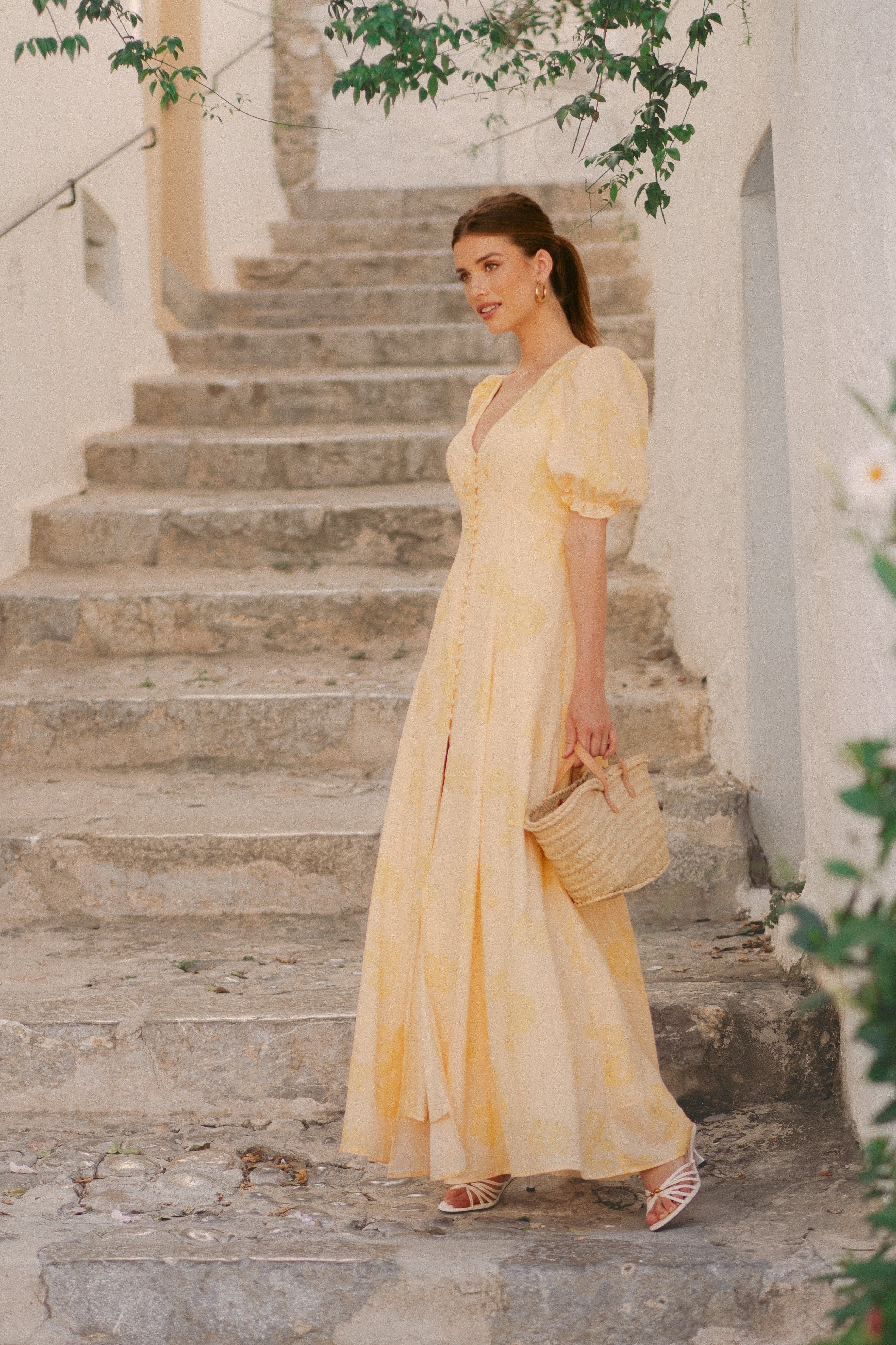 En drømmende og elegant maxikjole i en myk, lysegul tone med delikat blomsterprint. Kjolen har en flatterende V-utringning og en innsvingt midje som fremhever silhuetten på en feminin og sofistikert måte. De korte ermene gir et lett og sommerlig uttrykk, samtidig som de tilfører en avslappet eleganse, mens knappedetaljene foran gir et tidløst og eksklusivt preg.