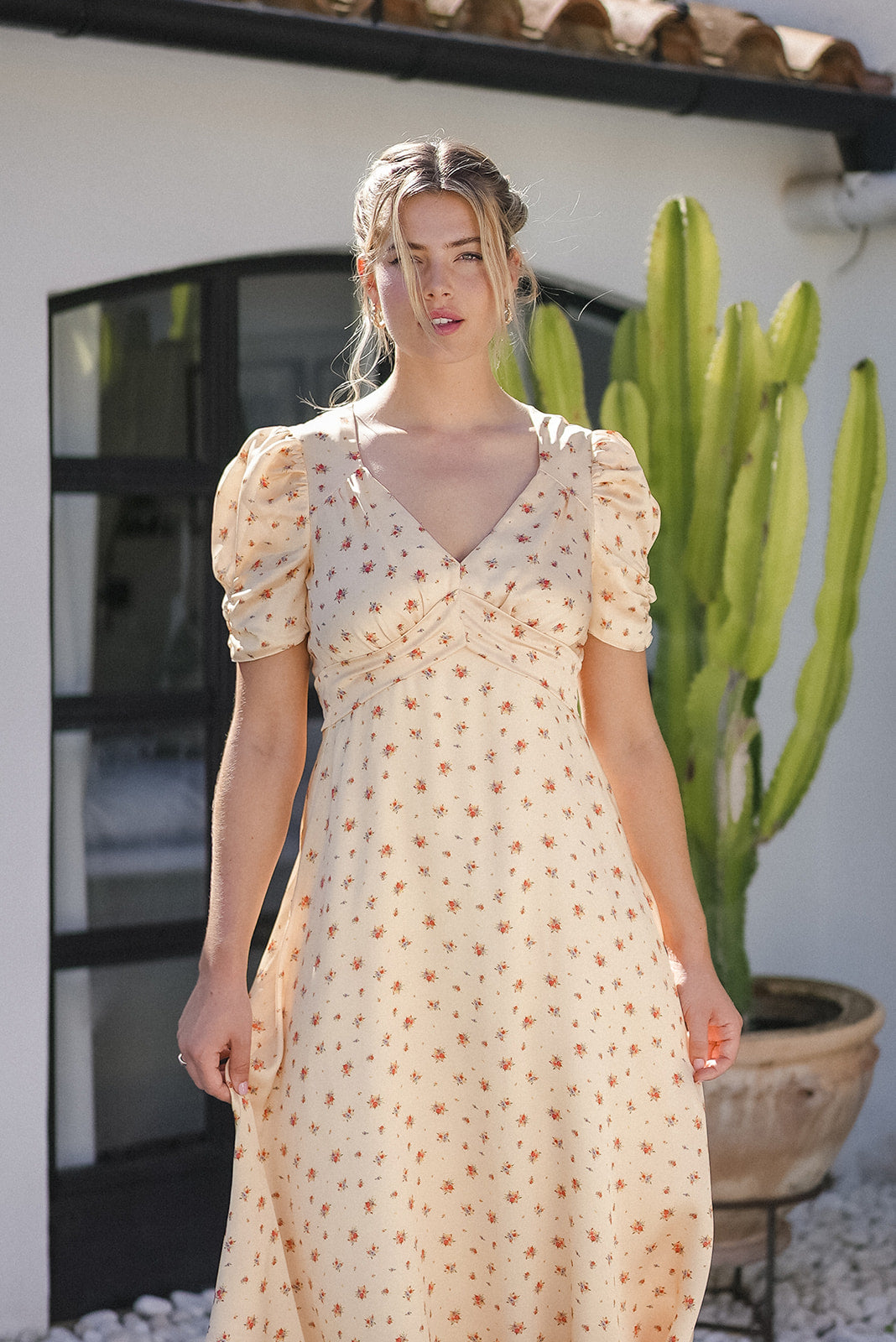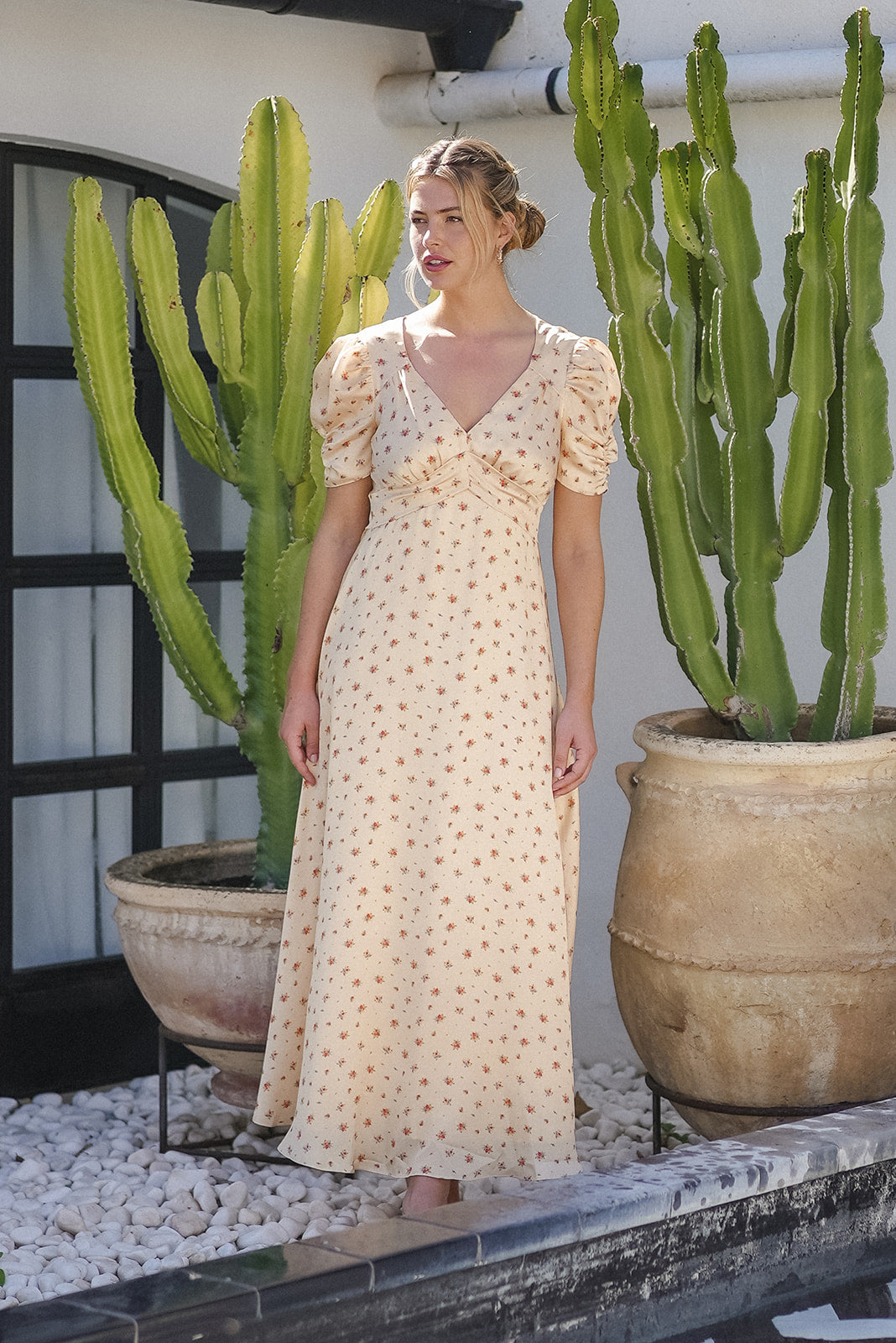 Nydelig gul kjole med rosa blomstermønster. Den har elegante, rysjede korte ermer som gir en luftig følelse. Kjolen lukkes med glidelås og er helt lukket bak. Den er også utringet og innsvingt med et belte i midjen, noe som fremhever figuren din på en smigrende måte. Kjolen er gulvlang og er liten i størrelsen over brystet og ryggen.