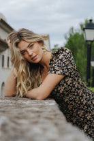Nydelig svart kjole med blomstermønster. Den har elegante, rysjede korte ermer som gir en luftig følelse. Kjolen lukkes med glidelås og er helt lukket bak. Den er også utringet og innsvingt med et belte i midjen, noe som fremhever figuren din på en smigrende måte. Kjolen er gulvlang og er liten i størrelsen over brystet og ryggen.