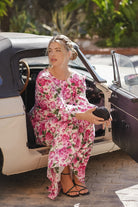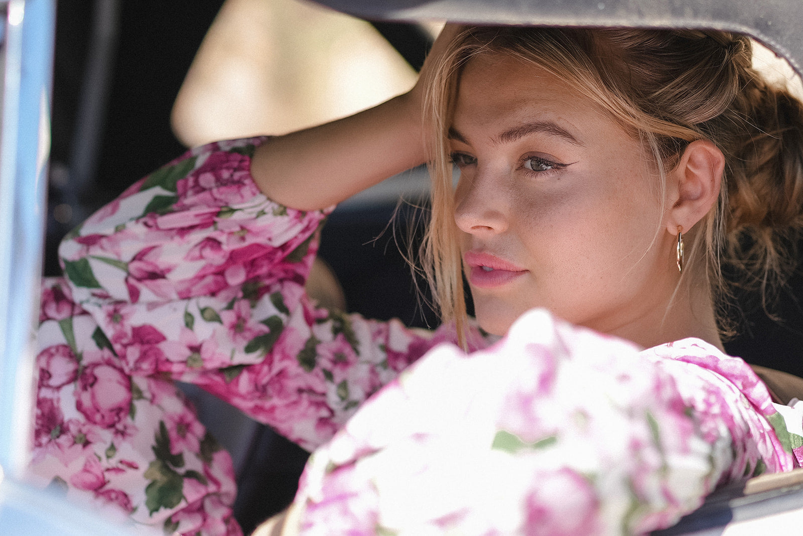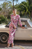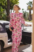 Nydelig figursydd kjole i hvit med blomster i nydelige rosatoner samt et innslag av grønne blader. Kjolen har luftige, lange ballongermer med elegante smockdetaljer på overarmen. Kjolen er gulvlang og har volang-kant nederst. Den er helt lukket bak og har en enkel rund hals. Kjolen lukkes med glidelås og er normal i størrelsen.