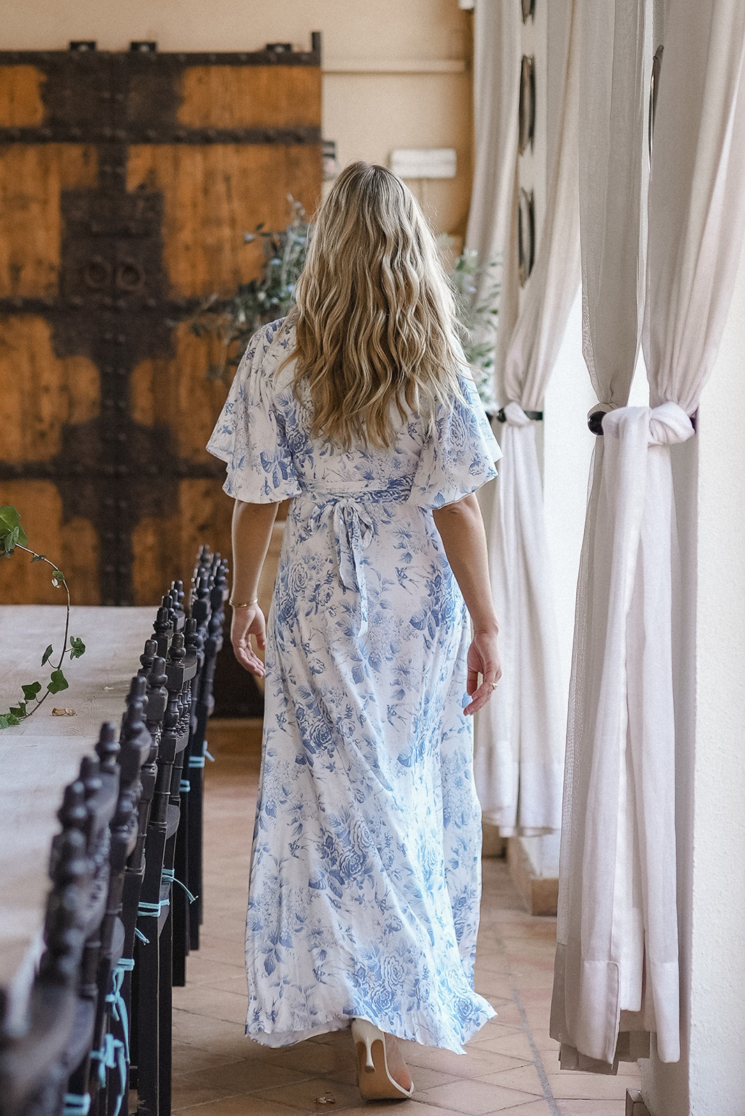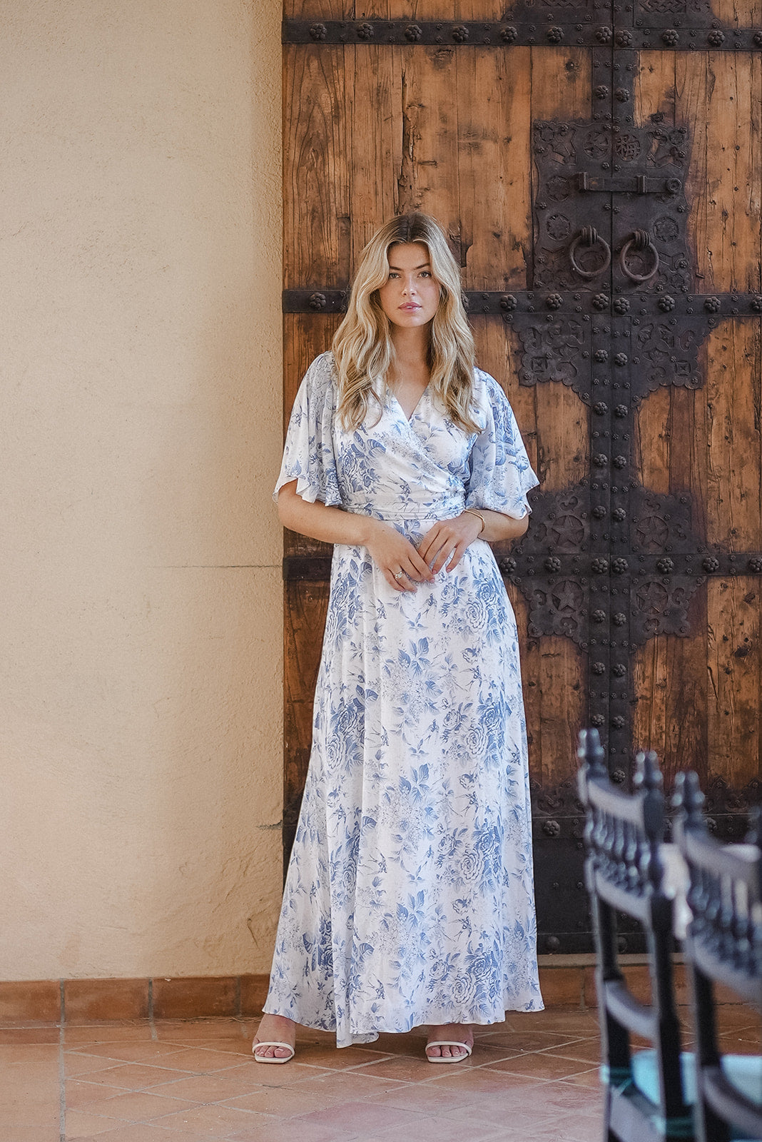 Superfin omslagskjole i hvit med blå blomsterdetaljer. Kjolen er foret, men ikke på ermene, noe som gir et deilig flagrende og luftige uttrykk. Kjolen er helt lukket bak, og lukkes med et lekkert knytebelte rundt midjen. Kjolen er normal i størrelsen.