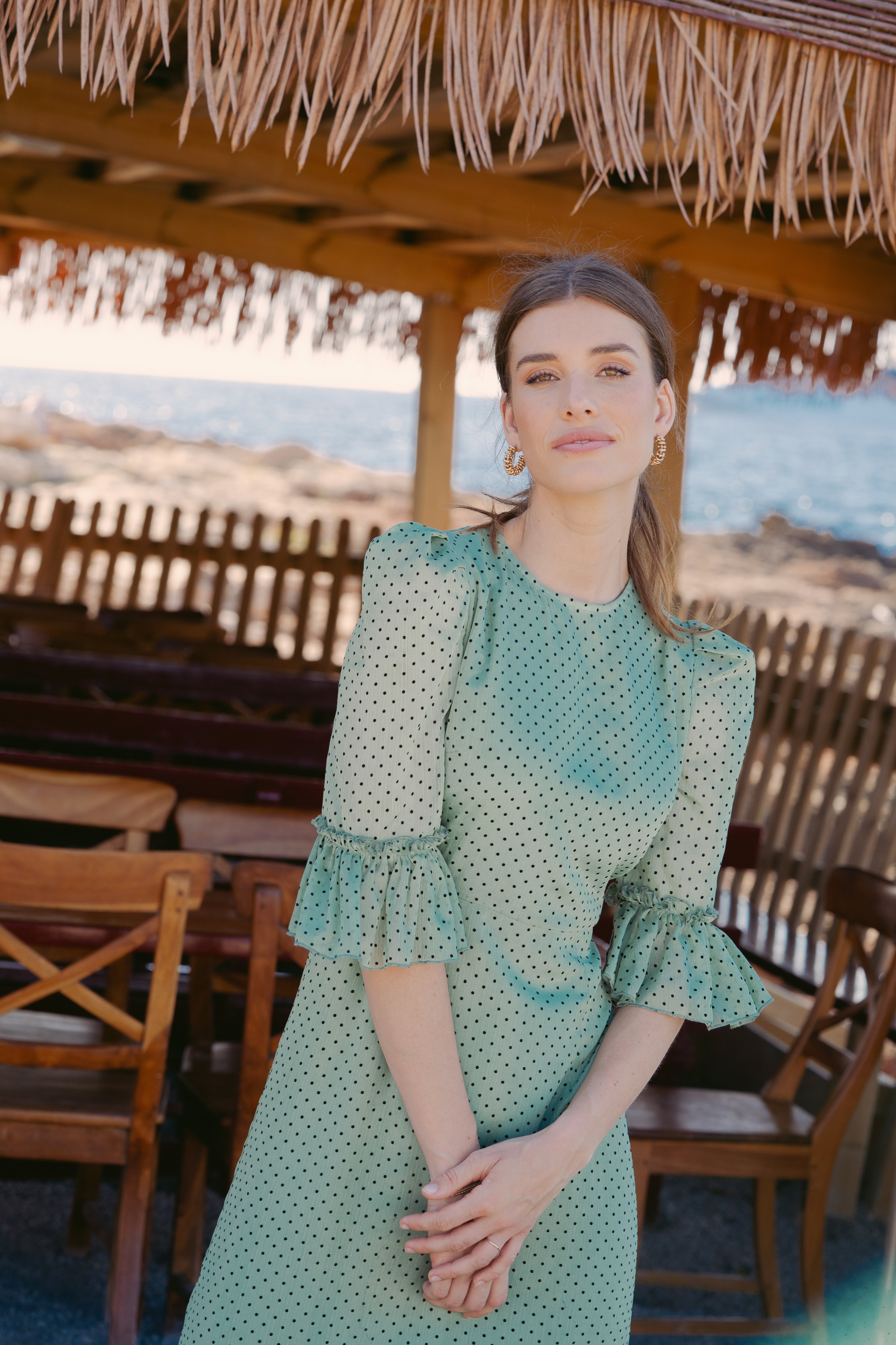 Beautiful form-fitting dress with tone-on-tone dots. The dress has 1/3 sleeves with a frill at the bottom. There is also a ruffle edge further down the dress. The dress is completely closed at the back, and closes with a zip.