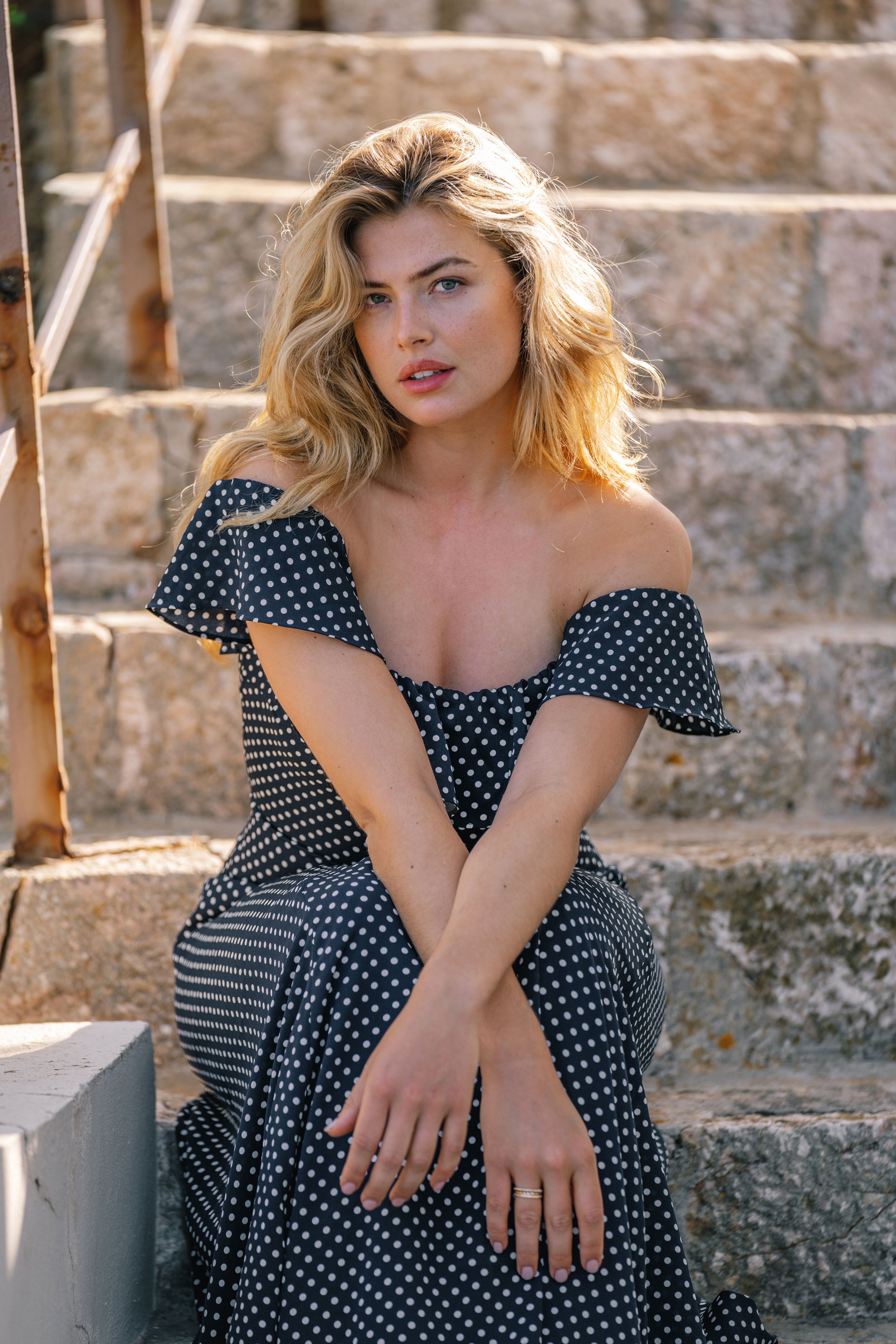 Nydelig ensfarget "off sholder" kjole i mørkeblå med hvite prikker. Modellen er figursydd med glidelås bak. Skjørtet har en stor vidde nederst som gjør at skjørtet blir luftig, og en drøm å danse med!