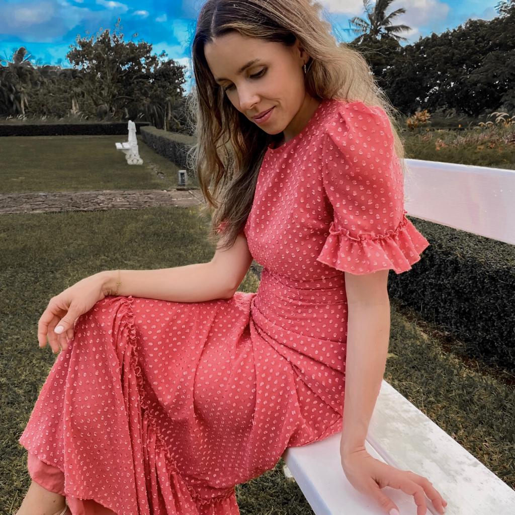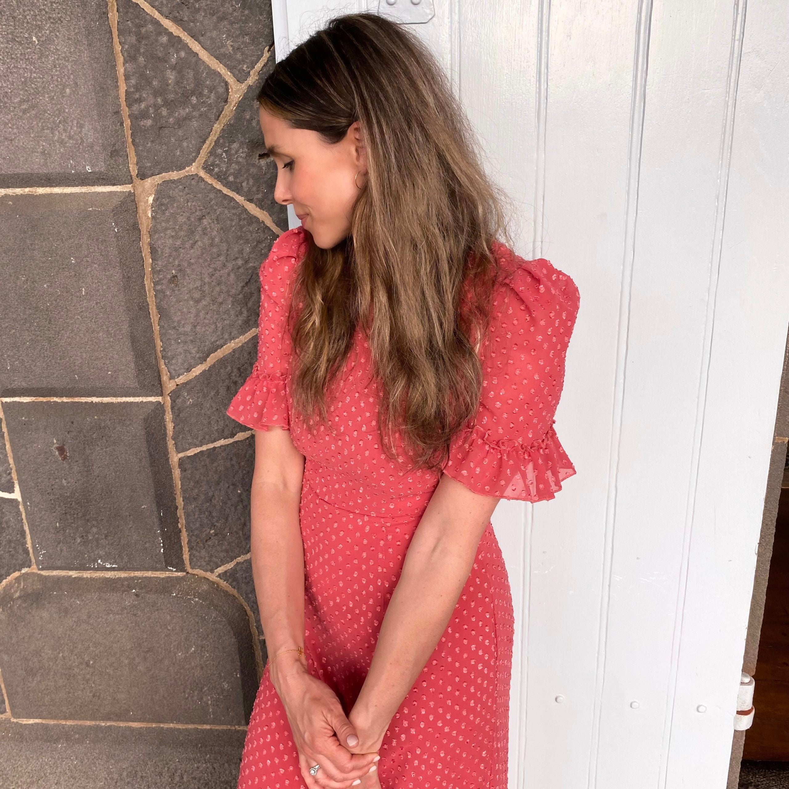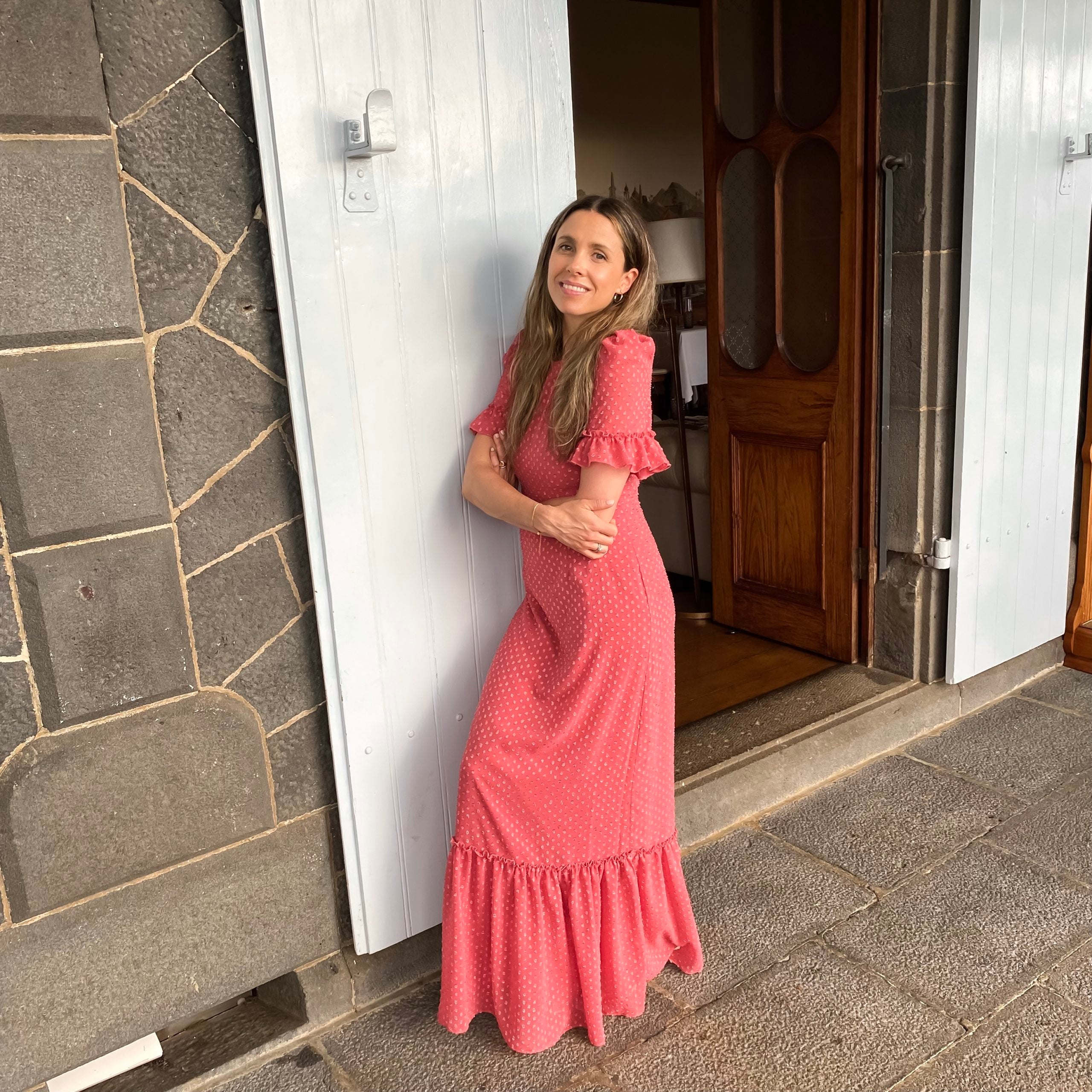 Nydelig figursydd kjole med ton i ton prikker. Kjolen har 1/3 armer med volang nederst. Det er også en volangkant lengre ned på kjolen. Kjolen er helt lukket bak, og lukkes med glidelås.
