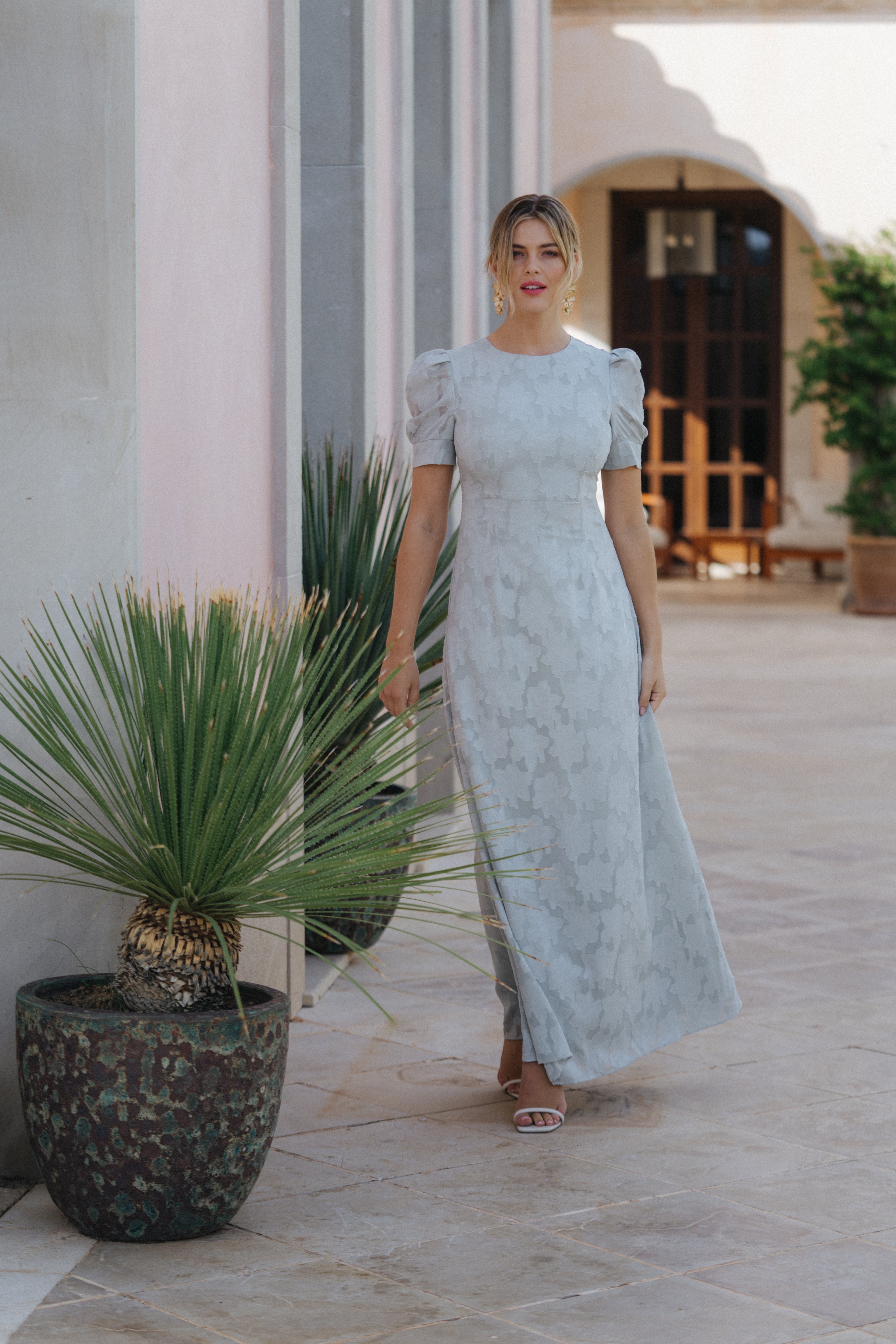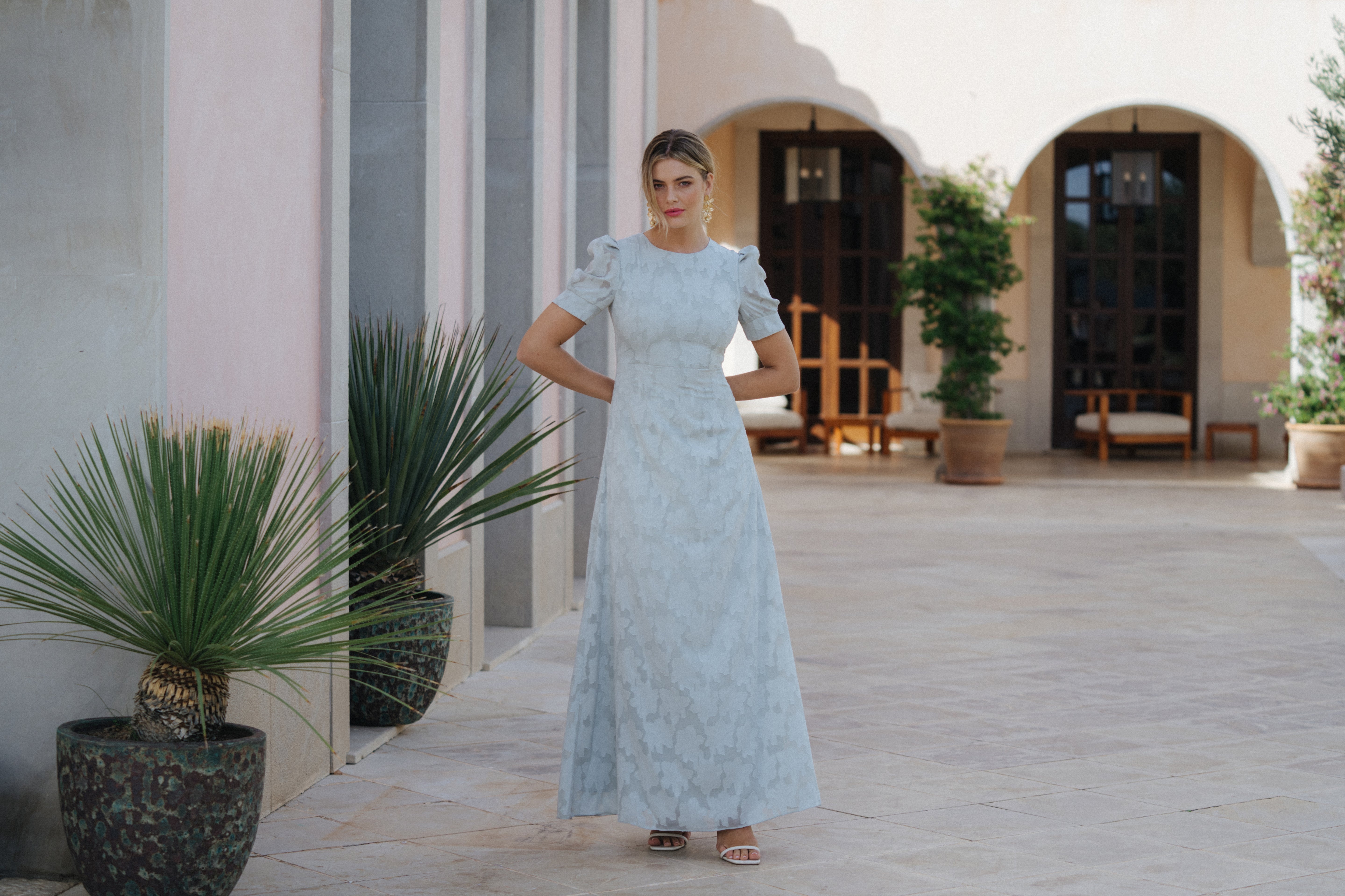 Nydelig figursydd kjole med ton i ton mønster. Kjolen har 1/3 armer og er foret. Kjolen er helt lukket bak, og lukkes med glidelås. Kjolen er liten i str, spesielt over rygg/bryst. Vi anbefaler å måle mot størrelsesguiden under.