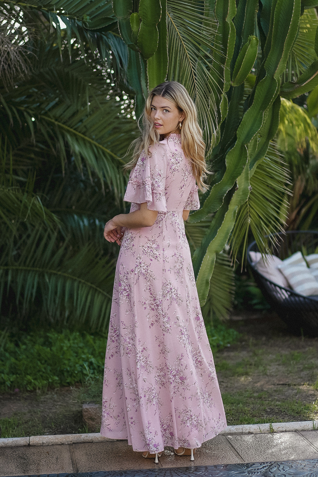Nydelig figursydd kjole i rosa med blomstermønster. Kjolen har 1/3 armer med volang nederst. Kjolen er helt lukket bak, og lukkes med glidelås. Kjolen er normal i størrelsen.