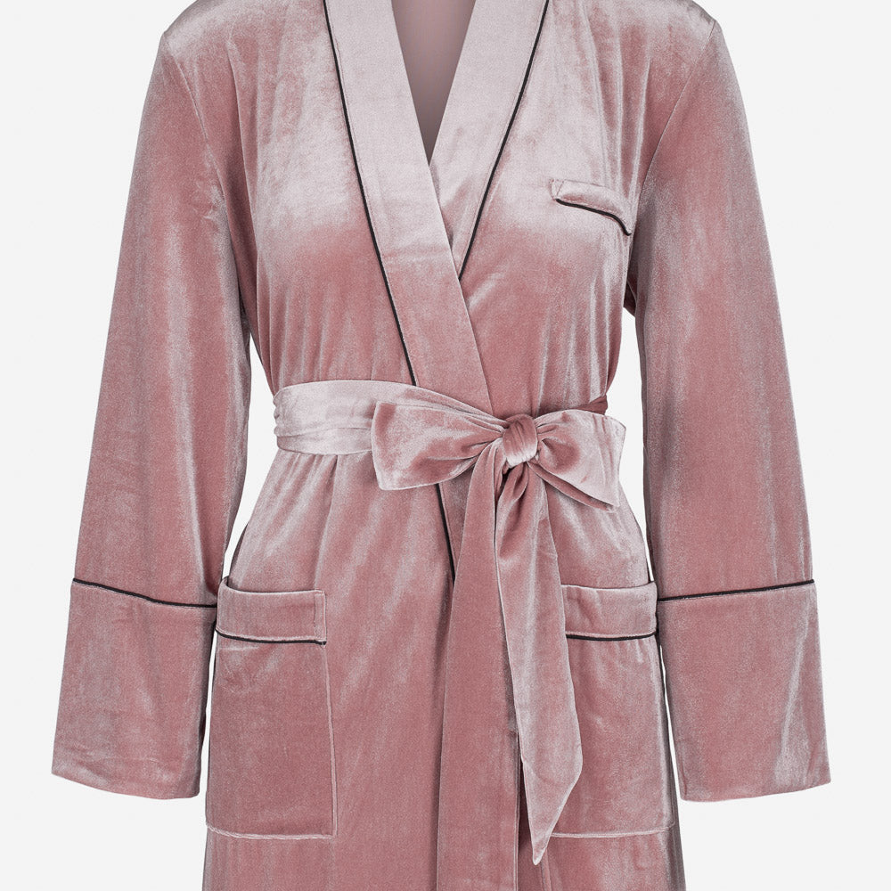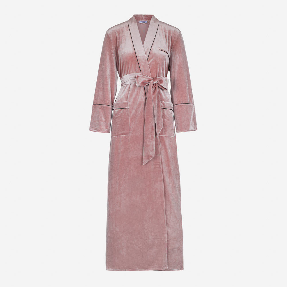 Nydelig fotsid morgenkåpe i fløyel med svarte sateng detaljer og bredt belte i livet. Perfekt til lange morgener og late dager. Morgenkåpen er 143 cm lang